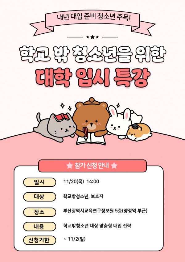 목록 대학 입시 특강 접수기간 11월 2일 정원 명 접수 2명 참가비 목록보기 신청하기 상세내용 <학교밖청소년을 위한 대입 특강> - 일시: 2025.11.20 (목) 14:00 - 장소: 부산광역시교육연구정보원 - 대상: 학교밖청소년, 보호자 - 내용: 내년 대입 계획 수립을 위한 정보 제공 프로그램참여현황 번호 이름 연락처 신청일자 처리상태 2 이** 010-3950-**** 2025-10-24 접수 1 정** 010-4324-**** 2025-10-24 접수 이전글 국립국제교육원 연계 2025년 4차 원격 영어회화교육 참여자 모집 25.10.24 목록 다음글 동아대학교 연계, 꿈드림 대상 신체활동 프로그램 참여자 모집 25.10.15