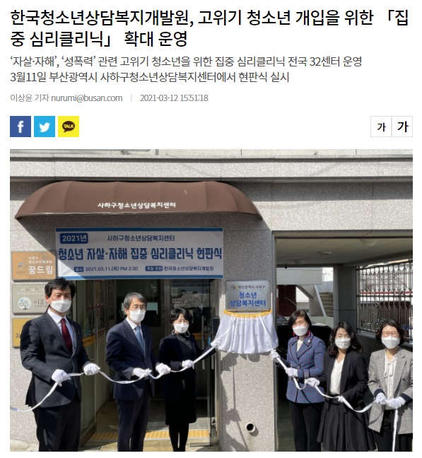 목록 한국청소년상담복지개발원, 고위기 청소년 개입을 위한 「집중 심리클리닉」 확대 운영(2021.03.12/부산일보) 페이지 정보 작성자 최고관리자 작성일 21-03-12 본문 2021.03.11 본센터에서 자살/자해 집중심리클리닉 현판식을 실시하였습니다! 관련링크 http://www.busan.com/view/busan/view.php?code=2021031215510630163 2736회 연결 이전글 청소년상담복지센터, '자살-자해' 대응 전문적 지원체계 구축(2021.03.25/내외뉴스통신) 21.03.25 목록 다음글 고위기청소년 맞춤 프로그램 '쎄쎄쎄' 주목..."안전에 만전"(2021.03.09/내외뉴스통신) 21.03.10