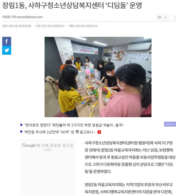 목록 장림1동, 사하구청소년상담복지센터 ‘디딤돌’ 운영(부산일보/2021.06.29) 페이지 정보 작성자 최고관리자 작성일 21-06-30 본문 장림1동행정복지센터와 연계하여 진행하고 있는 고위기맞춤형프로그램 '디딤돌'2차 기사가 보도되었습니다^-^* 관련링크 http://www.busan.com/view/busan/view.php?code=2021062909450642992 2672회 연결 이전글 사하구 꿈드림, 검정고시 100% 합격 外 (국제신문/2021.09.24) 21.09.28 목록 다음글 사하구 청소년안전망 선도 사업 호평(2021.06.10/국제신문) 21.06.22