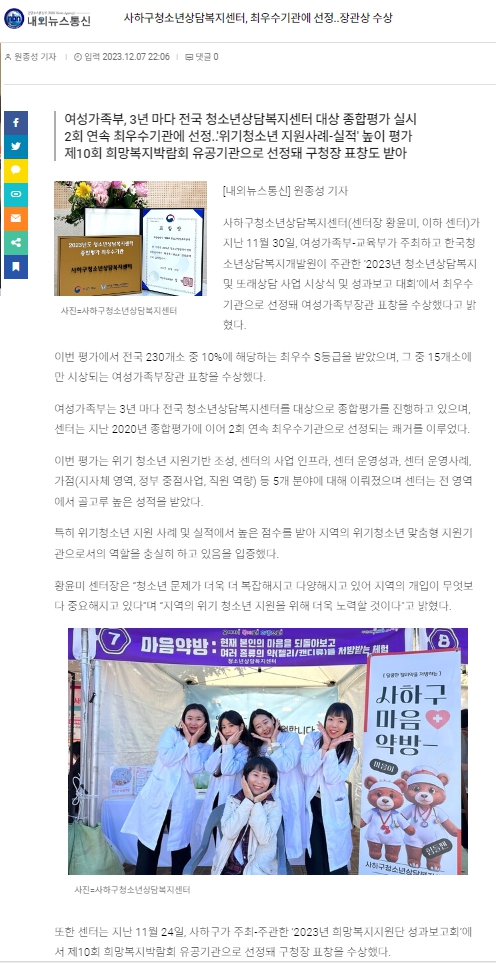 사하구청소년상담복지센터, 최우수기관에 선정..장관상 수상(2023.12.07)