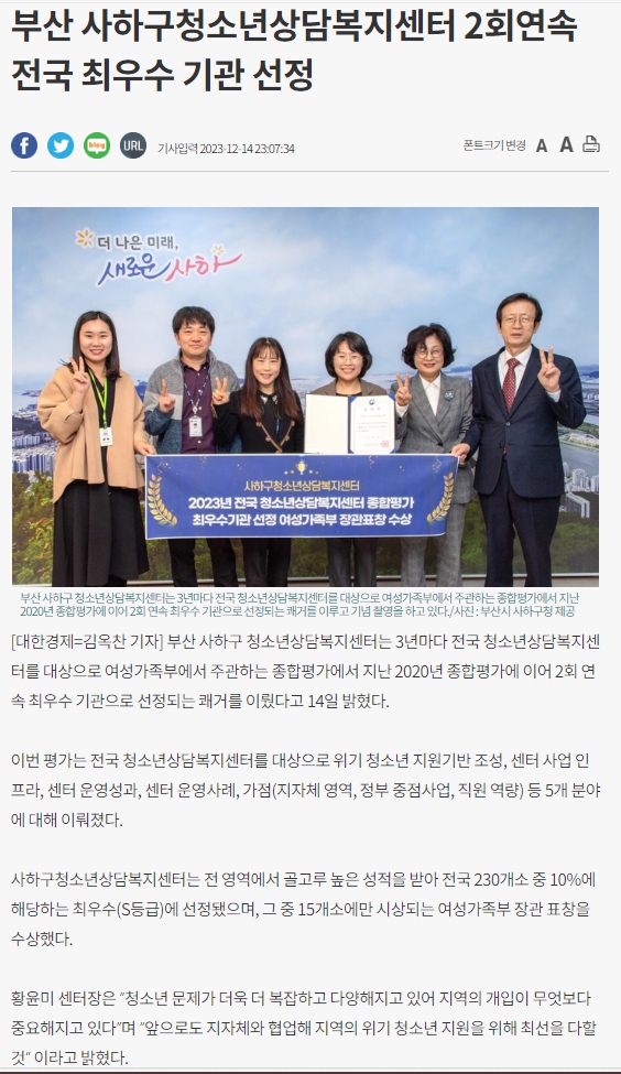 목록 대한경제부산 사하구청소년상담복지센터 2회연속 전국 최우수 기관 선정(2023.12.14) 페이지 정보 작성자 최고관리자 작성일 23-12-15 본문 . 관련링크 https://www.dnews.co.kr/uhtml/view.jsp?idxno=202312142306133170960 3936회 연결 이전글 사하구청소년상담복지센터 2회연속 전국 최우수 기관 선정(2023.12.14) 23.12.15 목록 다음글 사하구학교밖청소년지원센터(꿈드림) 해외 수학여행 실시(2023.10.18.) 23.12.13