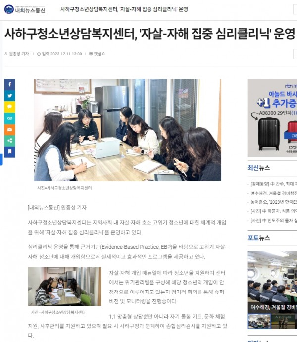 목록 내외뉴스통신사하구청소년상담복지센터, '자살-자해 집중 심리클리닉' 운영(2023.12.11) 페이지 정보 작성자 최고관리자 작성일 23-12-18 본문 , 관련링크 https://www.nbnnews.co.kr/news/articleView.html?idxno=816666 2337회 연결 이전글 지역사회 고위기 비행청소년 '부모교육' 만족도 높아(2023.12.20) 23.12.20 목록 다음글 사하구청소년상담복지센터 2회연속 전국 최우수 기관 선정(2023.12.14) 23.12.15