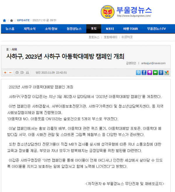 목록 부울경뉴스사하구, 2023년 사하구 아동학대예방 캠페인 개최(2023.11.09) 페이지 정보 작성자 최고관리자 작성일 23-11-10 본문 . 관련링크 http://www.bulgungnews.com/news/articleView.html?idxno=609445 2119회 연결 이전글 부산 사하구, 2023년 아동학대예방 캠페인 개최(2023.11.10) 23.11.29 목록 다음글 고위기청소년 위한 ‘사행시’ 운영..소통의 교육 지원(2023.11.03) 23.11.06