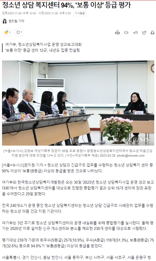 목록 뉴시스청소년 상담 복지센터 94%, '보통 이상' 등급 평가(2023.11.29) 페이지 정보 작성자 최고관리자 작성일 23-11-30 본문 . 관련링크 https://n.news.naver.com/article/003/0012237968?sid=102 4115회 연결 이전글 사하구, 수능일 ‘안전 귀가 캠페인’ 실시(2023.11.17) 23.12.05 목록 다음글 2023년 4차 사하구 청소년복지실무위원회 개최(2023.11.15) 23.11.29