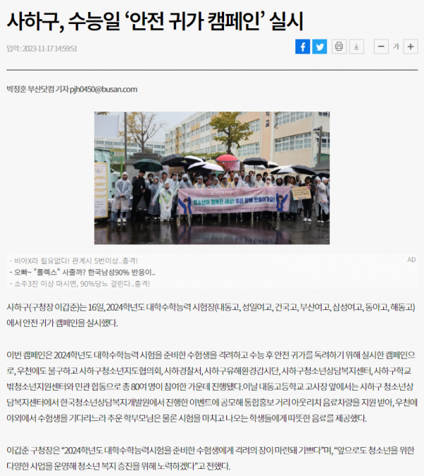 목록 부산일보사하구, 수능일 ‘안전 귀가 캠페인’ 실시(2023.11.17) 페이지 정보 작성자 최고관리자 작성일 23-12-05 본문 . 관련링크 https://www.busan.com/view/busan/view.php?code=2023111714580150238 1901회 연결 이전글 사하구청소년상담복지센터, 최우수기관에 선정..장관상 수상(2023.12.07) 23.12.11 목록 다음글 청소년 상담 복지센터 94%, '보통 이상' 등급 평가(2023.11.29) 23.11.30