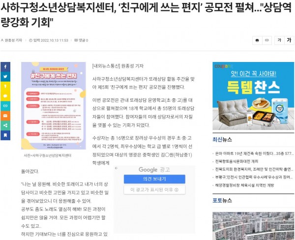목록 사하구청소년상담복지센터, ‘친구에게 쓰는 편지’ 공모전 펼쳐..."상담역량강화 기회"(내외뉴스통신/2022.… 페이지 정보 작성자 최고관리자 작성일 22-10-20 본문 . 관련링크 http://www.nbnnews.co.kr/news/articleView.html?idxno=709329 2800회 연결 이전글 한국주택금융공사 서부산지사,사하구학교밖청소년지원센터 후원금 전달(국제신문/2022.10.13.) 22.11.21 목록 다음글 사하구청소년지도협의회, 청소년 유해환경 개선 캠페인 실시(국제신문/2022.07.28) 22.10.13