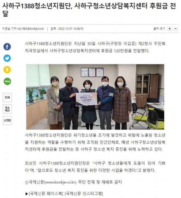 목록 국제신문사하구1388청소년지원단, 사하구청소년상담복지센터 후원금 전달(2022.12.01) 페이지 정보 작성자 최고관리자 작성일 22-12-02 본문 . 관련링크 https://www.kookje.co.kr/news2011/asp/newsbody.asp?key=20221201.990990… 2561회 연결 이전글 사하구청소년상담복지센터, 2022년 청소년상담복지사업 최우수기관 선정(2022.12.12) 22.12.15 목록 다음글 사하구1388청소년지원단, 사하구청소년상담복지센터 후원금 전달(2022.12.01) 22.12.02