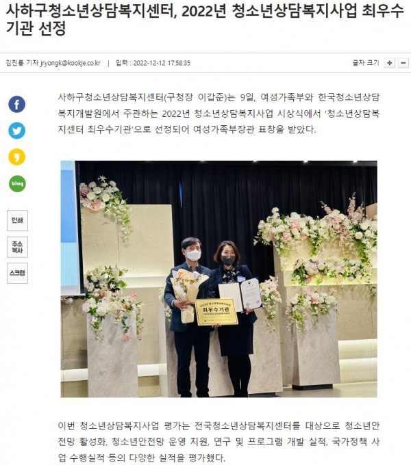 목록 국제신문사하구청소년상담복지센터, 2022년 청소년상담복지사업 최우수기관 선정(2022.12.12) 페이지 정보 작성자 최고관리자 작성일 22-12-15 본문 . 관련링크 http://www.kookje.co.kr/news2011/asp/newsbody.asp?code=0300&key=202212… 2476회 연결 이전글 사하구청소년상담복지센터, 여성가족부장관 표창 수상(2022.12.15) 22.12.16 목록 다음글 사하구1388청소년지원단, 사하구청소년상담복지센터 후원금 전달(2022.12.01) 22.12.02