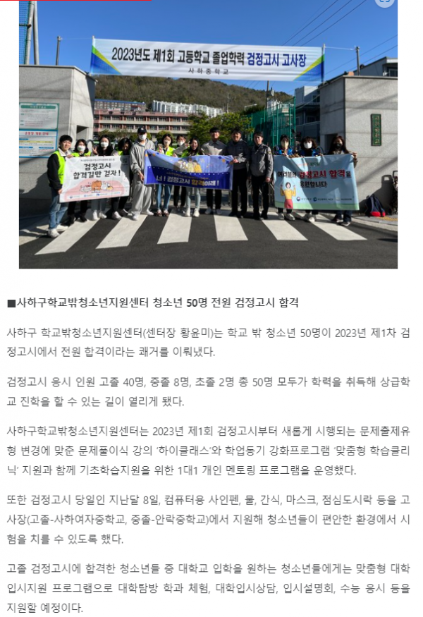 목록 위클리 오늘사하구학교밖청소년지원센터 청소년 50명 전원 검정고시 합격(2023.05.16) 페이지 정보 작성자 최고관리자 작성일 23-05-16 본문 . 관련링크 http://www.weeklytoday.com/news/articleView.html?idxno=569900 2465회 연결 이전글 사하구 고위기청소년맞춤형 프로그램 ‘디딤돌’ 운영(2023.05.26) 23.05.31 목록 다음글 심야 시간 폭증하는 아이들의 SOS…24시 상담센터의 밤(2023.05.05) 23.05.08