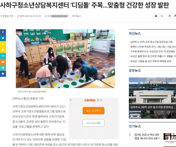 목록 사하구청소년상담복지센터 ‘디딤돌’ 주목...맞춤형 건강한 성장 발판(내외뉴스통신/22.06.23) 페이지 정보 작성자 최고관리자 작성일 22-08-01 본문 . 관련링크 http://www.nbnnews.co.kr/news/articleView.html?idxno=684212 2621회 연결 이전글 사하구청소년상담복지센터, ‘사!행!시’ 운영...소년범 재범방지 해결책 찾아(내외뉴스통신/22.06.23) 22.08.01 목록 다음글 사하구 꿈드림, 검정고시 합격 쾌거(국제뉴스/2022.05.24.) 22.05.30