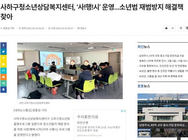 사하구청소년상담복지센터, ‘사!행!시’ 운영...소년범 재범방지 해결책 찾아(내외뉴스통신/22.06.23)