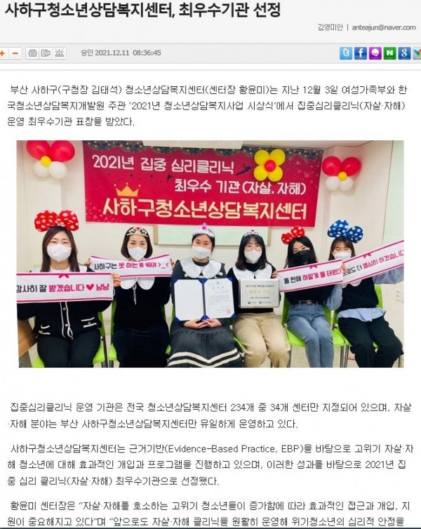 목록 사하구청소년상담복지센터, 최우수기관 선정(2021.12.11/부울경뉴스) 페이지 정보 작성자 최고관리자 작성일 21-12-14 본문 . 관련링크 http://www.bulgungnews.com/news/articleView.html?idxno=588324 2691회 연결 이전글 사하구 학교밖청소년지원센터 꿈드림, 우수기관 선정(국제신문/2021.12.06.) 22.01.04 목록 다음글 한국주택금융공사 서부산지사 한국주택금융공사 서부산지사, 후원금 전달(2021.12.13/국제뉴스) 21.12.14