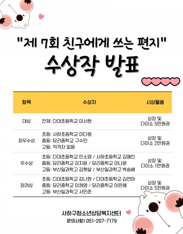 제7회 '친구에게 쓰는 편지' 공모전 수상자 발표입니다.