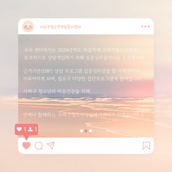 목록 청소년상담복지센터 ♡ 2024 자살자해 고위기청소년 맞춤지원사업 집중심리클리닉 ♡ 페이지 정보 작성자 최고관리자 조회 4,601회 작성일 24-04-05 본문 2024년 집중심리클리닉 사업 안내입니다. 이전글 4월 소식지 24.04.22 목록 다음글 ♡ 2024 위기청소년 특별지원 안내 ♡ 24.04.04