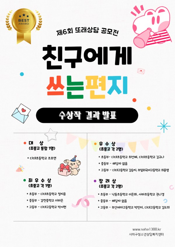 청소년상담복지센터 [수상자 발표] 제 6회 또래상담 "친구에게 쓰는 편지" 공모전 수상자 발표