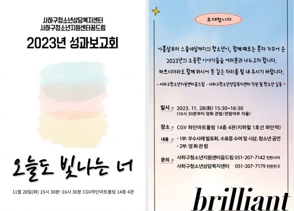 목록 전체공지 2023년 사하구청소년상담복지센터&사하구청소년지원센터꿈드림 성과보고회; 오늘도 빛나는 너 페이지 정보 작성자 최고관리자 조회 5,112회 작성일 23-11-13 본문 2023년 사하구청소년상담복지센터&사하구청소년지원센터꿈드림 성과보고회에 초대합니다:) 이전글 12월 소식지 23.12.12 목록 다음글 11월 소식지 23.11.13