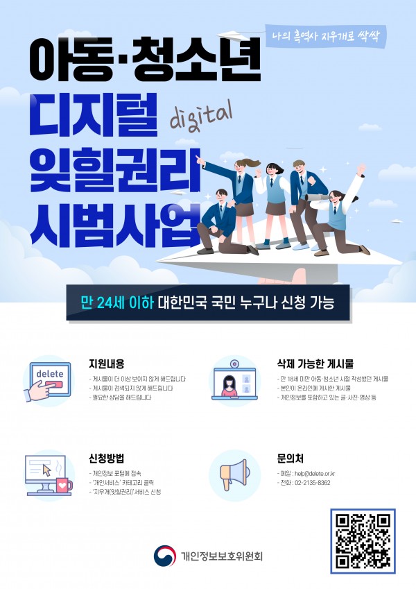 목록 청소년지원센터꿈드림 아동·청소년 디지털 잊힐권리 시범사업안내 페이지 정보 작성자 최고관리자 조회 4,539회 작성일 23-05-10 본문 . 이전글 5월 소식지 23.05.10 목록 다음글 학교 밖 청소년 건강검진 이벤트 안내 23.05.10