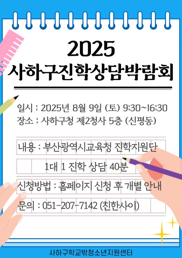 - 일시 : 2025.08.09.(토) 9:30~16:30(시간 내 40분 개별 상담)- 장소 : 사하구청 제2청사 5층(신평동)