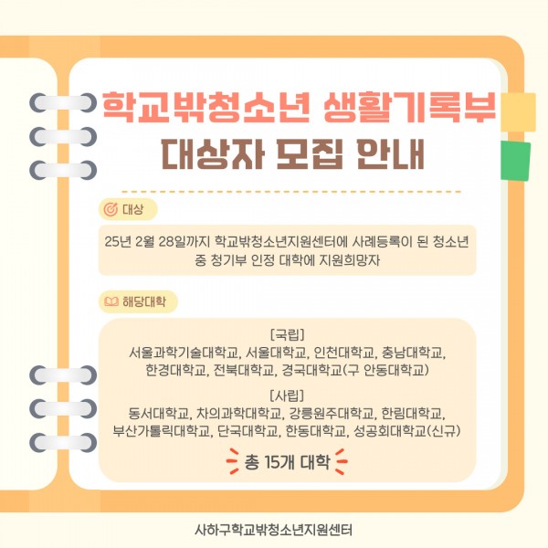 목록 학교밖청소년 청소년생활기록부 대상자 모집 접수기간 6월 27일 정원 명 접수 2명 참가비 목록보기 상세내용 [학교밖청소년을 위한 청소년생활기록부 안내] 신청기간 : 2025.06.27(금)까지 문의 : 051-207-7142(친한사이) 최유리 선생님 프로그램참여현황 번호 이름 연락처 신청일자 처리상태 2 이** 010-4764-**** 2025-06-23 접수 1 이** 010-4764-**** 2025-06-12 접수 이전글 [동아리] 또래상담 동아리원 모집 25.06.11 목록 다음글 [건강지원] 단체 건강검진 받으러 가자~ 25.06.04