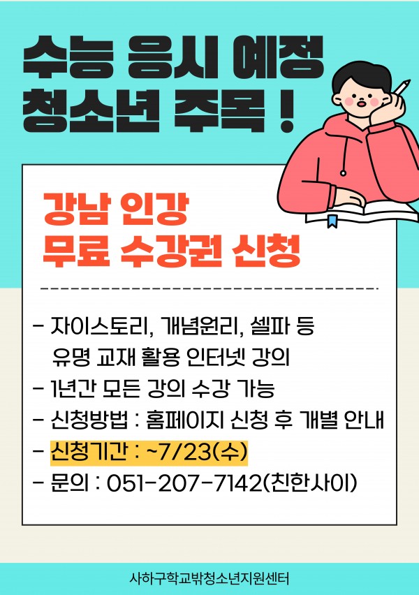 ❍ 대 상 : 강남인강 수강 희망 학교밖청소년❍ 내 용 : 수능 대비 인강 희망 청소년 대상 강남인강 수강권 제공(8월 이후 제공 예정)