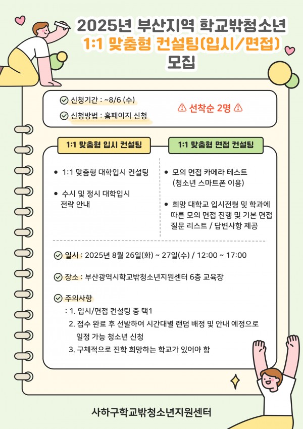 목록 학교밖청소년 1:1 맞춤형 대입 컨설팅 접수기간 8월 6일 정원 2명 접수 2명 참가비 목록보기 상세내용 - 일시 : 8월 26일~27일 12시~17시 중 - 장소 : 부산광역시학교밖청소년지원센터 6층 교육장 - 1:1 맞춤형 입시 컨설팅 혹은 1:1 맞춤형 면접 컨설팅 참여 프로그램참여현황 번호 이름 연락처 신청일자 처리상태 2 허** 010-9041-**** 2025-08-04 접수 1 김** 010-3892-**** 2025-08-04 접수 이전글 청소년비즈쿨 창업투어 25.08.07 목록 다음글 단체 영화관람 25.07.22