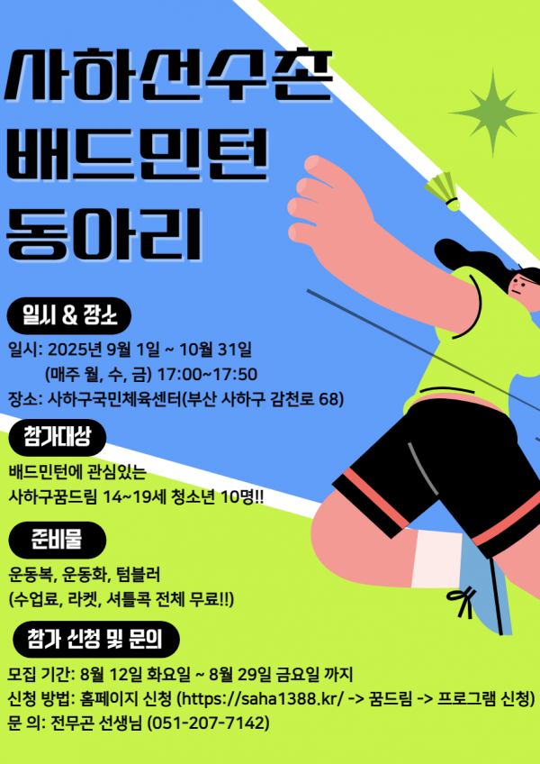 배드민턴에 관심있는 사하구꿈드림 14~19세 청소년 10명!!