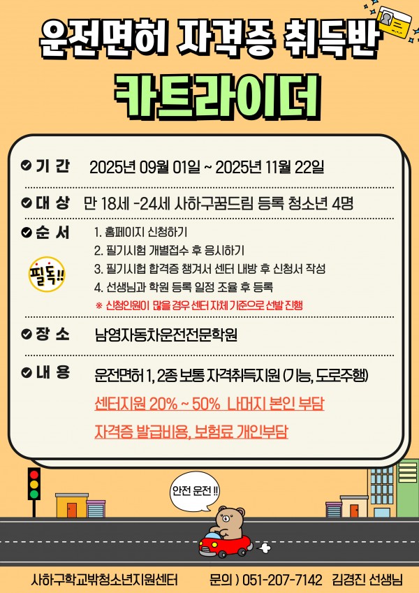 운전면허자격취득지원 '카트라이더' 참여 청소년 모집-일시 : 2025년 09월 01일~11월 22일(학원 스케줄에 맞춰 개인별 수업)