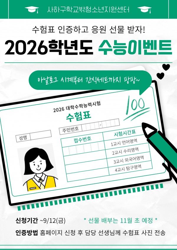 - 대상 : 2026학년도 수능 접수 청소년- 내용 : 수능 지원물품 제공(아날로그 시계, 간식 등)