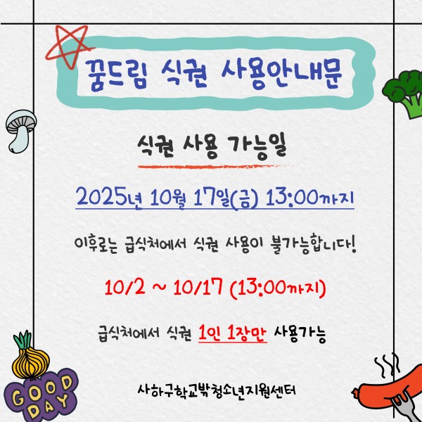 목록 2025년 꿈드림 식권 사용 종료 안내문 접수기간 정원 명 접수 0명 참가비 목록보기 상세내용 2025년 꿈드림 식권 사용 종료 안내문 식권 사용 가능일 : 2025년 10월 17일(금) 13:00까지 이후로는 식권 사용이 불가능합니다 ! * 10/2 ~ 10/17(13:00까지) 급식처에서 식권 1인 1장만 사용 가능 * 대체식품 마일리지 모음 12장 사용 X 문의) 051-207-7142 (김경진 선생님) 프로그램참여현황 번호 이름 연락처 신청일자 처리상태 이전글 건강검진하고 기프티콘 받자!! 25.10.15 목록 다음글 건강검진하고 기프티콘 받자!! 25.09.23