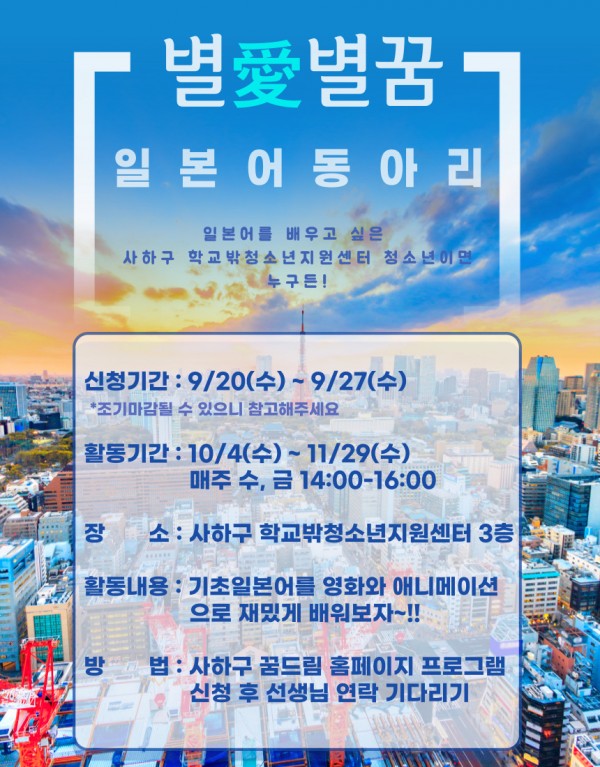☆★자기계발 언어동아리 별愛별꿈 '일본어 동아리' 모집!!★☆▶ 기간 : 2023. 10. 04.(수) ~ 11. 29.(수)