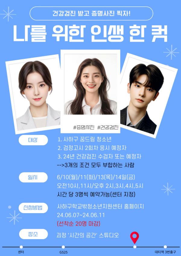 내용 : 대상자 증명사진 무료지원 / 6/10(월),11(화),13(목),14(금) 오전10시,11시,오후2시~5시(시간당 3명씩 예약 가능 ) -- 센터에서 지정해줌