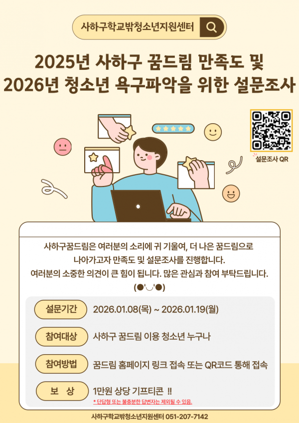 ○ 2025년 사하구꿈드림 만족도 및 2026년 청소년 욕구파악 설문조사여러분의 소리에 귀 기울여, 더 나은 꿈드림으로 나아가고자 만족도 및 설문조사를 진행합니다.