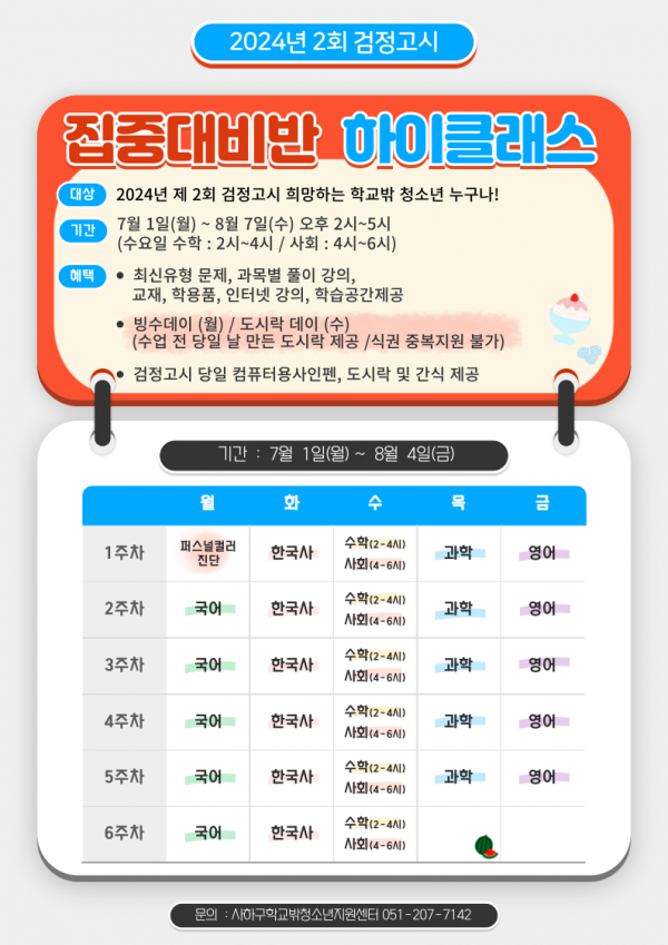 특전 : 월- 빙수데이 수- 도시락 데이 (식권 중복 불가) , 하이클래스 교재 제공, 개근 3등까지 선물 증정