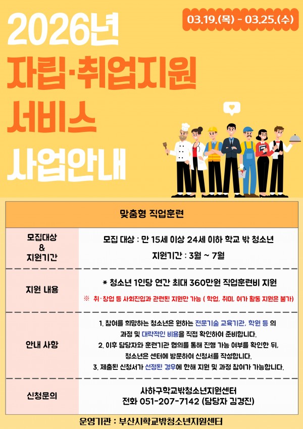 [2026년 자립·취업지원서비스 모집안내]신청대상 : 만 15세 ~ 24세 사하구 학교 밖 청소년