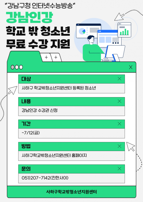 <강남인강 수강권 신청 안내>대상 : 사하구 꿈드림 등록 청소년 / 수능 대입 준비하는 학교밖청소년