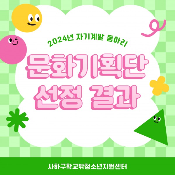 [문화예술동아리] '문화기획단' 선정 청소년 발표2024년 문화예술동아리 '문화기획단' 청소년 모집에 지원해 주신 분들께 감사드립니다.