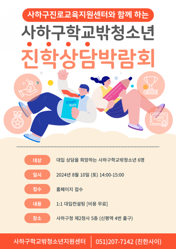 대상 : 검정고시 합격 청소년 / 대학 또는 학과가 정해진 청소년일시 : 2024.08.10(토) 14:00 ~ 15:00