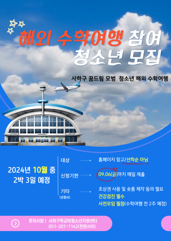 □ 예상일정 : 참여 청소년 모집(~09.06) -> 신청 청소년 면접(09.09~09.11) -> 참여 청소년 확정(~09.13) -> 사전모임(09.20~) -> 해외 수학여행