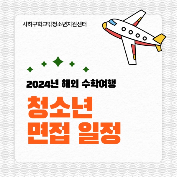 2024년 해외 수학여행 모집에 지원해 주신 분들께 감사드립니다. 서류 통과 청소년 및 면접 진행 시간은 아래와 같습니다.*청소년(핸드폰 번호 뒷자리)