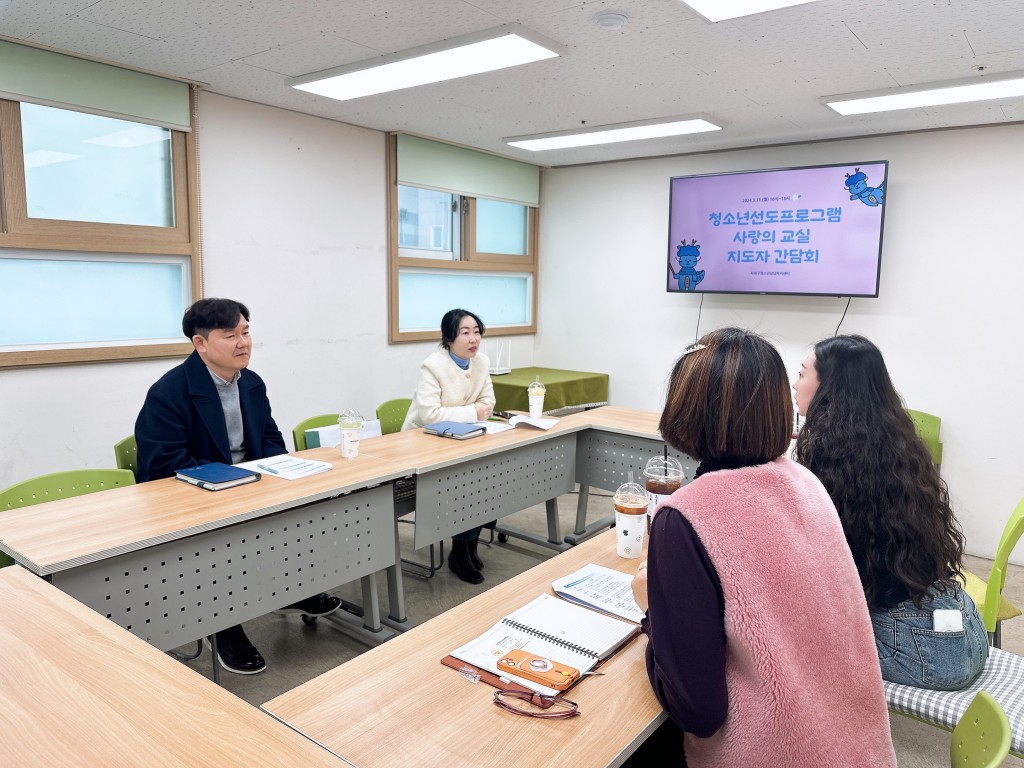 [사랑의 교실] 지도자 간담회 페이지 정보 작성자 최고관리자 댓글 0건 조회 1,157회 작성일 24.04.03 목록 본문 일 자 : 2024.03.11(월)장 소 : 본 센터 3층 교육실내 용 : 사하경찰서 SPO팀장님, 사랑의교실 담당 경사님 모시고 청소년선도프로그램 관련하여 지도자 간담회를 실시하였습니다 이전글 [또래] 제1차 또래상담 동아리 지도자 간담회 24.04.03 목록 다음글 [긴급솔루션회의] 제1차 긴급솔루션회의 24.04.03