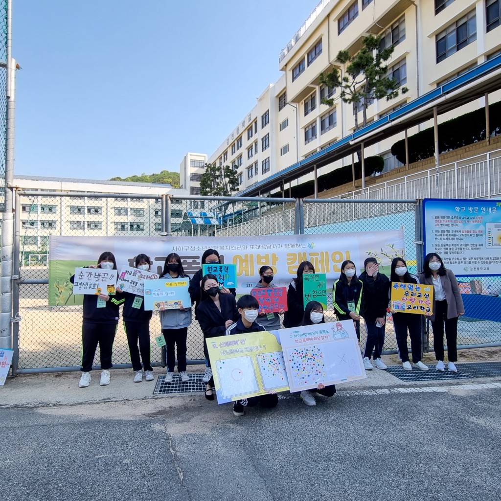 [또래상담] 등굣길 학교폭력예방 캠페인(감천중) 페이지 정보 작성자 최고관리자 댓글 0건 조회 1,831회 작성일 22.05.13 목록 본문 일 시 : 2022.05.02.(월) 08:00-09:00 장 소 : 감천중학교내 용 : 11명의 또래상담자들과 함께 학교 폭력 예방캠페인 및 아웃리치를 진행하였습니다 이전글 [또래상담] 등굣길 학교폭력예방 캠페인(부산여고) 22.05.13 목록 다음글 [자살자해집중심리클리닉] 위기관리팀 3차 회의 22.05.13