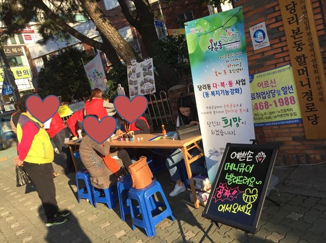 다복동과 함께한 본경로당 8차 아웃리치! 페이지 정보 작성자 최고관리자 댓글 0건 조회 2,659회 작성일 17.10.24 목록 본문 건명 : 8차 아웃리치 일시 : 2017.10.20(금) 장소 : 본경로당 앞 내용 : 지역주민 대상 네일아트제공, 청소년상담복지센터 안내 등 이전글 [또래상담]부산여자고등학교 찾아오는 또래오래 활동 17.10.27 목록 다음글 [다복동 사레발표 및 역량강화 워크숍] 17.09.23