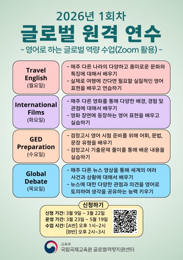 2026년 1회차 글로벌역량지원센터 글로벌 원격 연수(학교 밖 청소년) 신청 (~3/22)